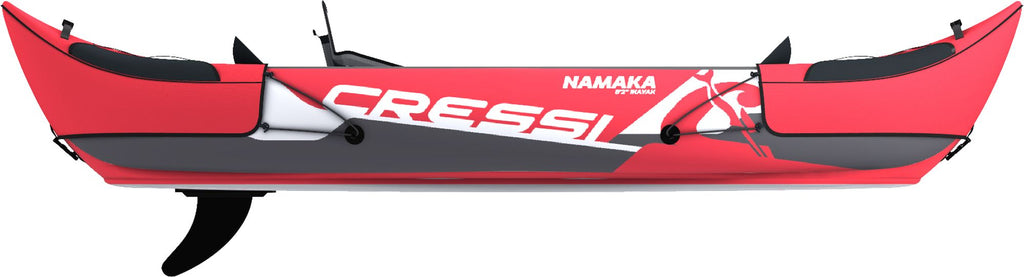 Namaka is the cressi kayak created to explore the coasts and nature, to move silently and reach places inaccessible by sailing or swimming, with zero emissions and the utmost respect for the marine environment. Available in two versions, single or double seat, namaka is an inflatable kayak with excellent stability thanks to its air chambers with tubular sections, which are ideal for following the waves. Comfort is ensured by the inflatable seats that provide a raised paddling position, while the velcro strips and adjustable straps allow the lumbar support to be moved and adapted along the entire cockpit. Namaka is equipped with nylon linings at the bow and stern with splash guards, practical bungee cords, handles to help carry it out of the water, a velcro oar holder and reinforced bottom with anti-abrasion layer. Both models are ready-to-use sets, supplied with all the accessories needed for inflation and immediate use, from the pump to the paddles (two for the double and one for the single) up to the quick-hooking fins. Made of hermetic 1000-denier weft multilayer material to provide the best stiffness/weight ratio. Lateral tubular air chambers with dedicated valves and reinforced anti-abrasion 7-compartment base. Lightweight construction for maximum comfort and performance. Certified according to the international quality and safety standard iso 6185-1 iii b